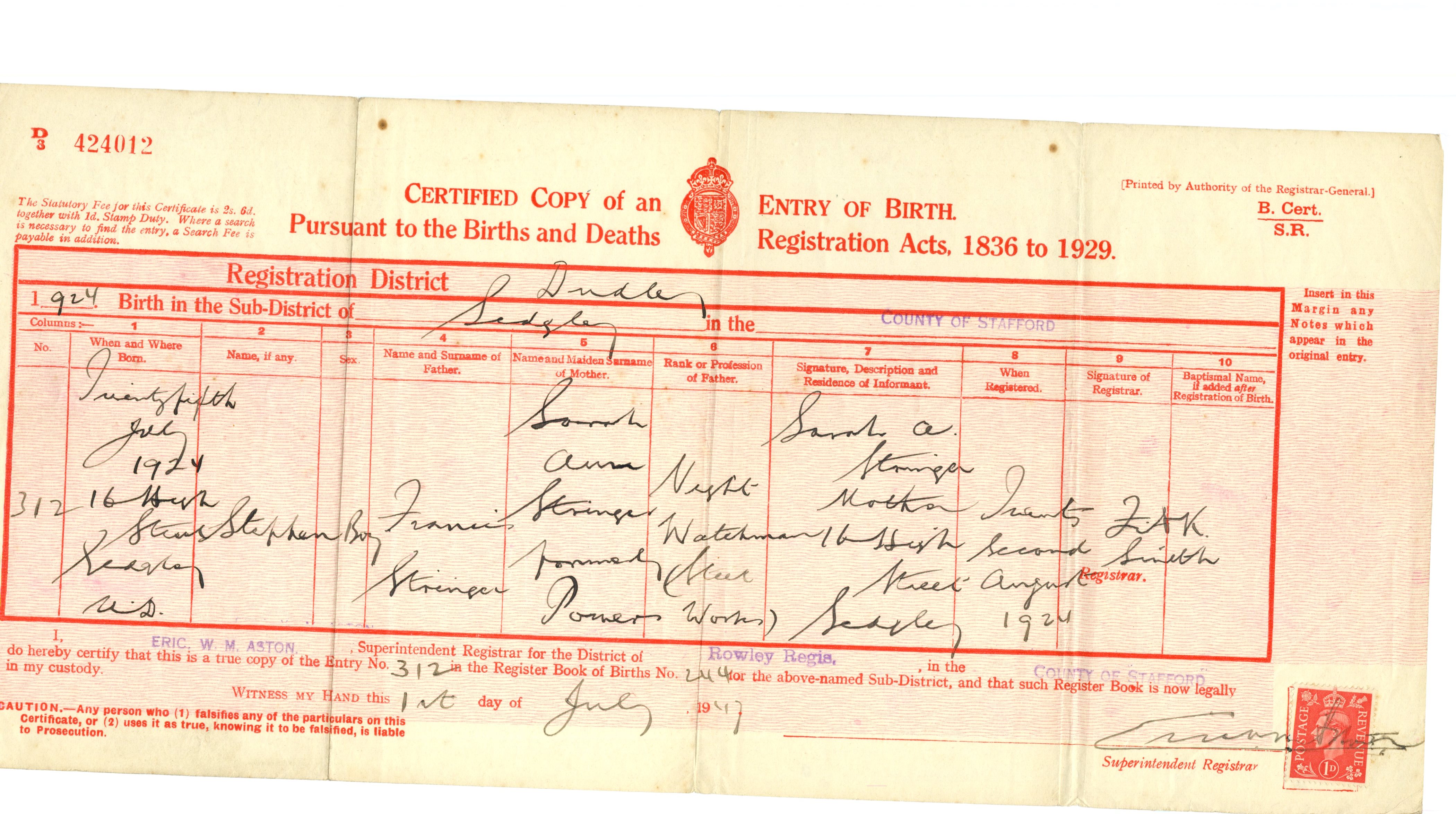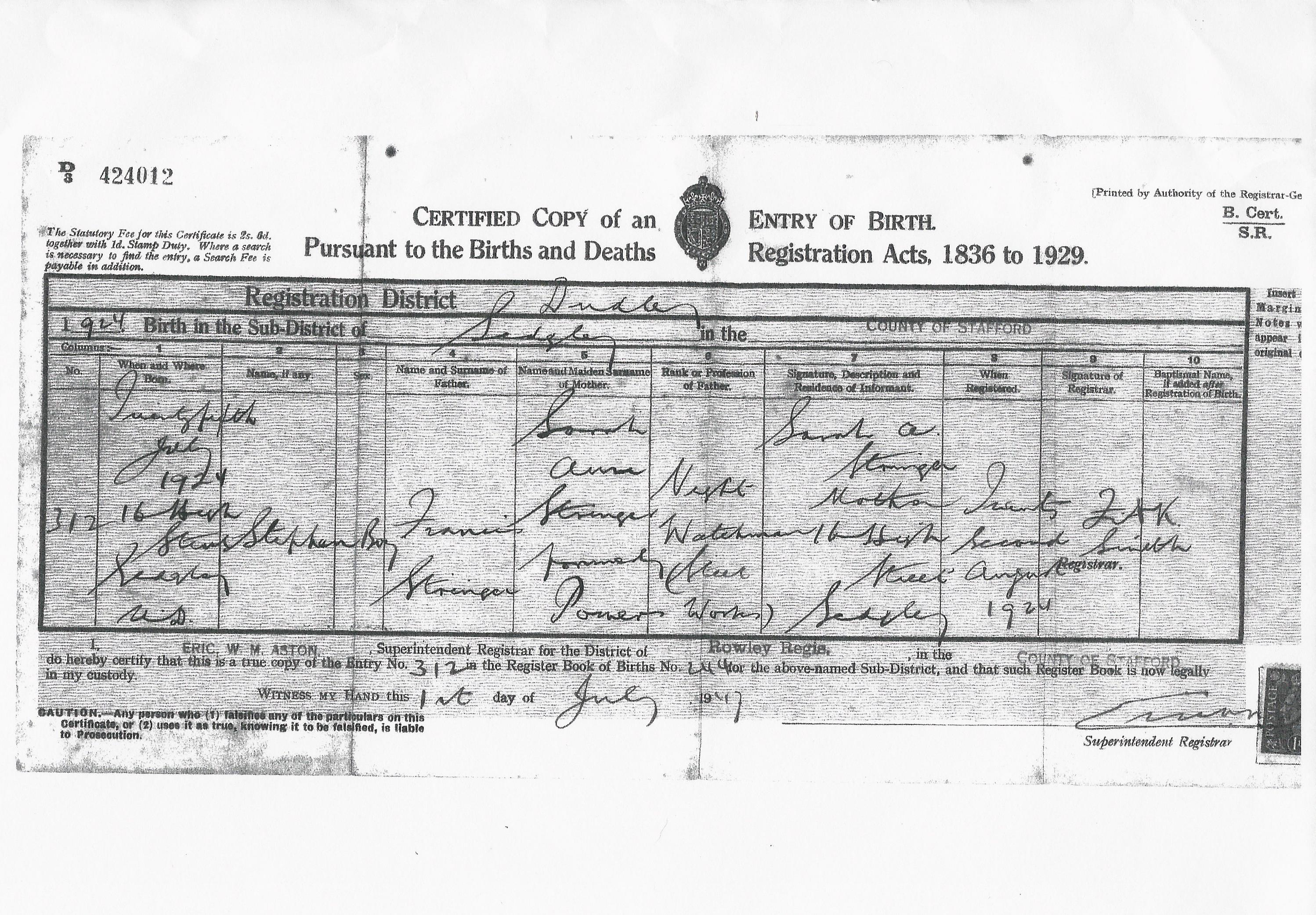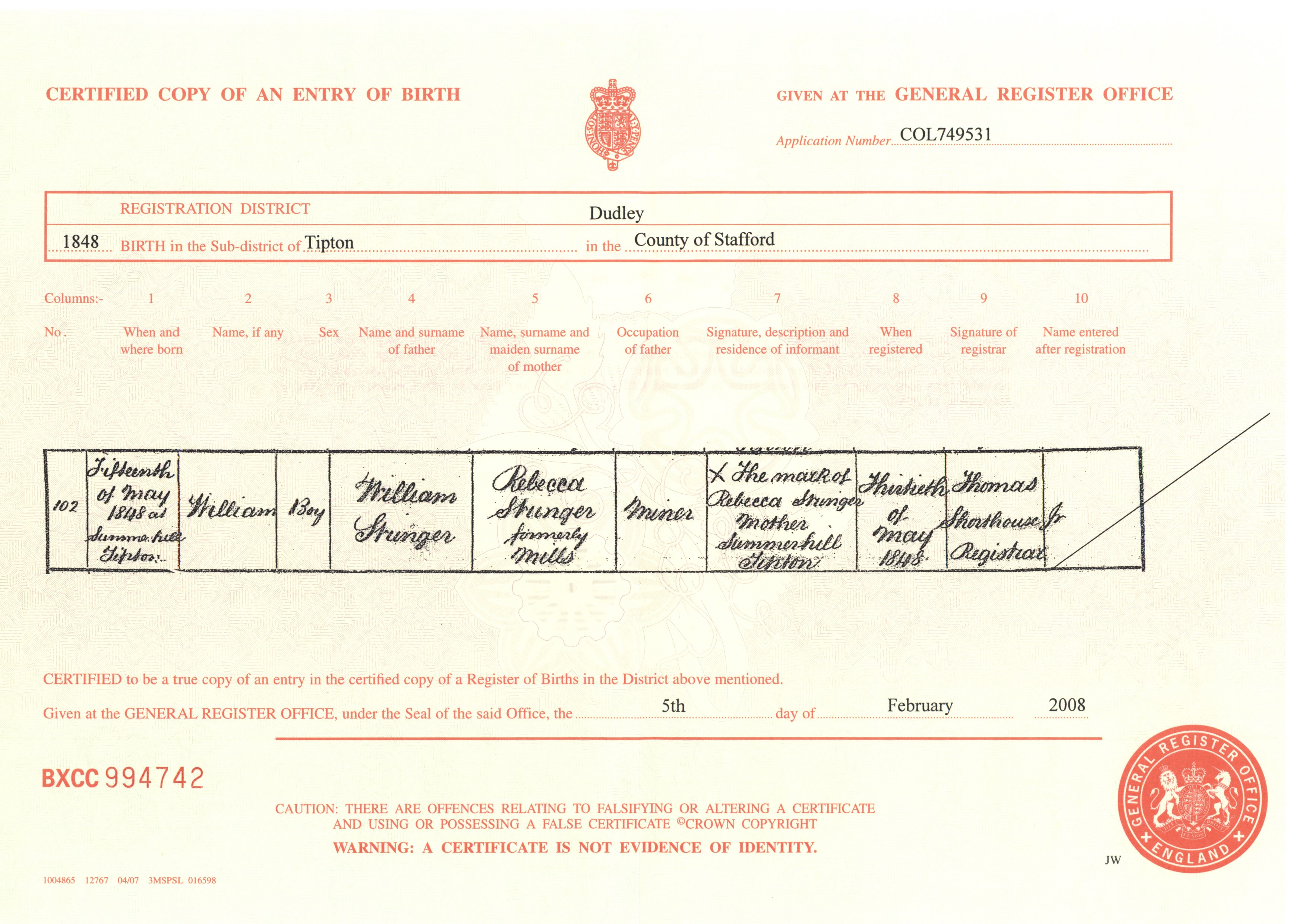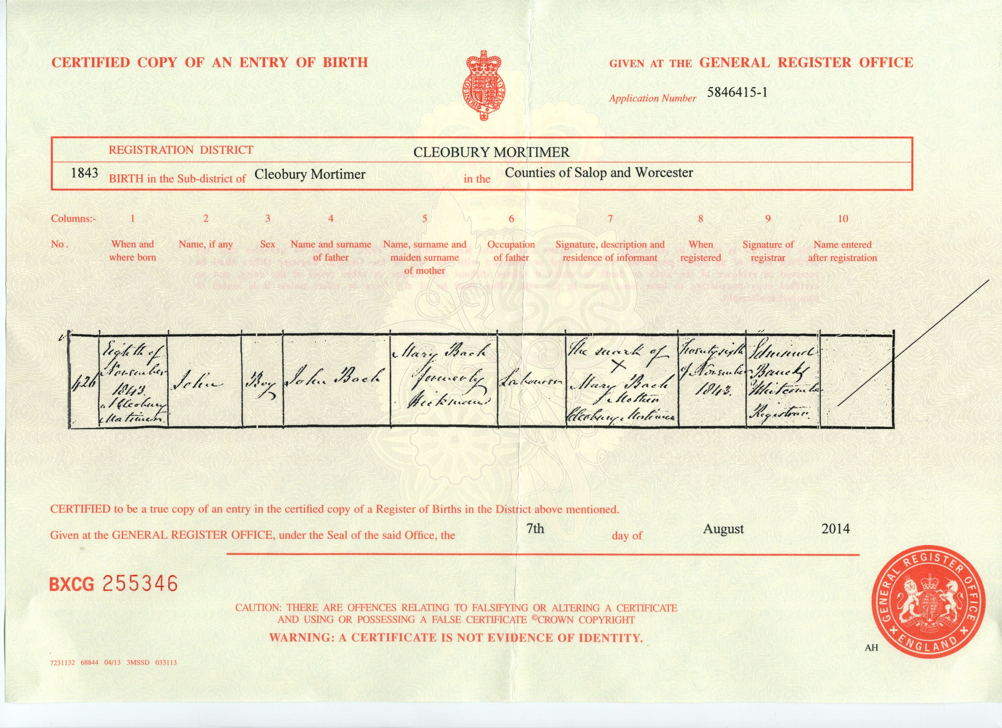Birth Cert for John ..>