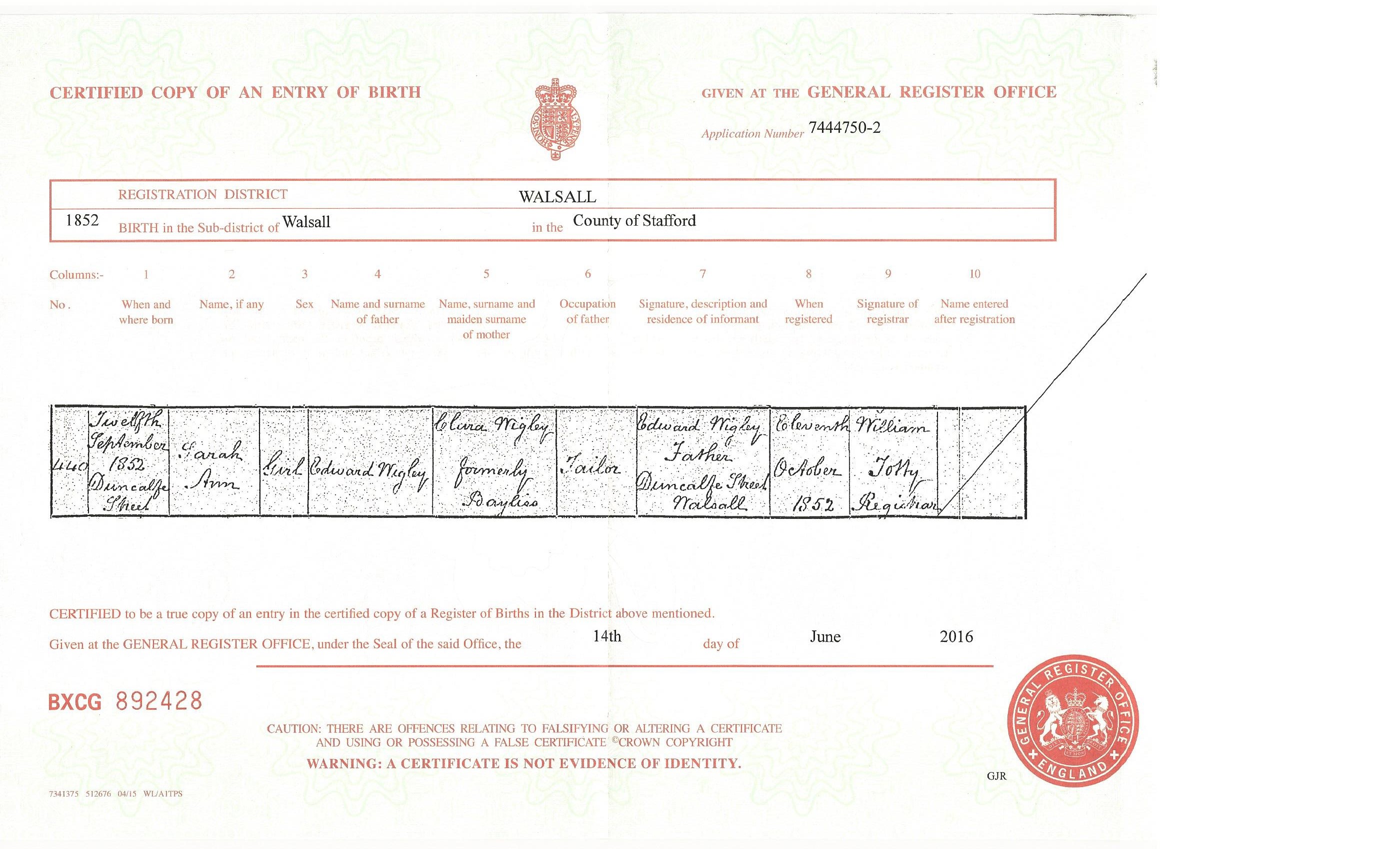 Sarah Ann Wigley Bir..>